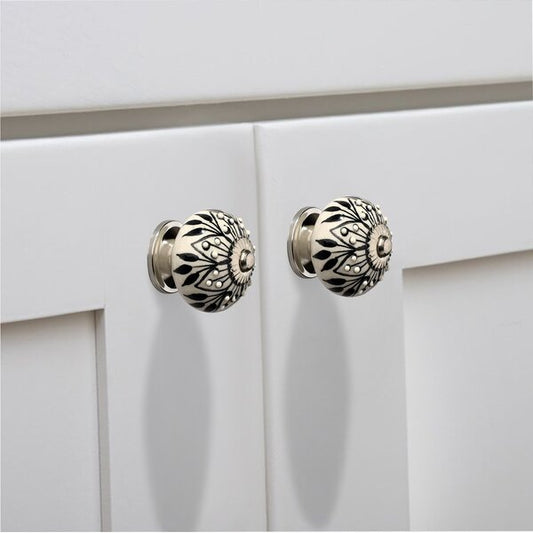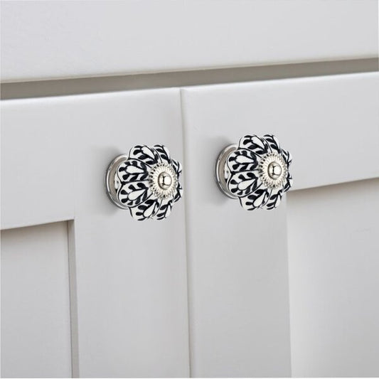 Black 1-3/5 in. Flower on White Melon Cabinet Knob